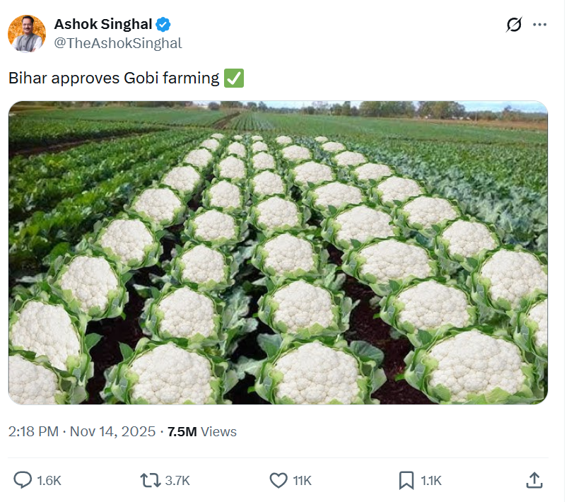 কিছু ছবি নীরব থাকলেও সেগুলো যেন সহস্র শব্দের চেয়েও বেশি কিছু বলে। সম্প্রতি বিহারের বিধানসভা নির্বাচনের পূর্ণ ফল প্রকাশের পূর্বমুহূর্তে আসামের বিজেপির মন্ত্রী অশোক সিংঘল তার এক্স হ্যান্ডেলে যে “বিহার অ্যাপ্রুভস গোবি ফার্মিং” উদ্ধৃতির সাথে ফুলকপির ক্ষেতের ছবি পোস্ট করলেন, তা কি শুধুই একটি ক্ষেতের ছবি? নাকি এটি নির্দিষ্ট কোনো সম্প্রদায়ের প্রতি প্রচ্ছন্ন বার্তা?