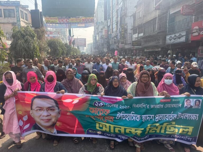 বিএনপির ভারপ্রাপ্ত চেয়ারম্যান তারেক রহমানের স্বদেশ প্রত্যাবর্তনকে কেন্দ্র করে ফেনীতে আনন্দ মিছিল অনুষ্ঠিত হয়েছে। ফেনী সদর উপজেলা ও পৌর বিএনপির উদ্যোগে মঙ্গলবার (২৩ ডিসেম্বর) সকালে এই কর্মসূচি পালন করা হয়। মিছিলটি শহরের গুরুত্বপূর্ণ সড়ক প্রদক্ষিণ করে সংক্ষিপ্ত সমাবেশের মাধ্যমে শেষ হয়।