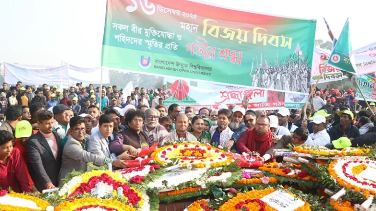 শ্রদ্ধা নিবেদন শেষে উপাচার্য অধ্যাপক ড. ওবায়দুল ইসলাম বলেন, “মহান বিজয় দিবস আমাদের জাতির গৌরবের অনন্য শিখর। জাতির সূর্যসন্তানদের আত্মত্যাগ, অদম্য সাহস ও রক্তের বিনিময়ে আমরা অর্জন করেছি লাল-সবুজের পতাকা ও স্বাধীন সার্বভৌম বাংলাদেশ। এই বিজয় শুধু ভূখণ্ডের নয়, এটি মর্যাদা, মানবিক মূল্যবোধ ও স্বাধীন স্বপ্নের বিজয়। বৈষম্যহীন ও ন্যায়ভিত্তিক গণতান্ত্রিক রাষ্ট্র গড়ে তোলার স্বপ্ন বাস্তবায়নই শহিদদের প্রতি প্রকৃত শ্রদ্ধা। অবাধ, সুষ্ঠু ও অংশগ্রহণমূলক নির্বাচনই নতুন প্রজন্মকে সাম্য, ন্যায় ও অগ্রগতির বাংলাদেশ উপহার দিতে হবে।”