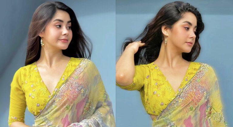 শাড়ির সঙ্গে মিলিয়ে রোজা পরেছেন উজ্জ্বল হলুদ রঙের ভি-নেক ব্লাউজ। সাজে রেখেছেন স্নিগ্ধতার ছাপ—স্মোকি আই মেকআপ, ন্যুড লিপস্টিক আর খোলা চুলে তিনি হয়েছেন আরও আকর্ষণীয়। ফলে ছবিতে তার রূপ যেন বহুগুণে বেড়ে যায়।
