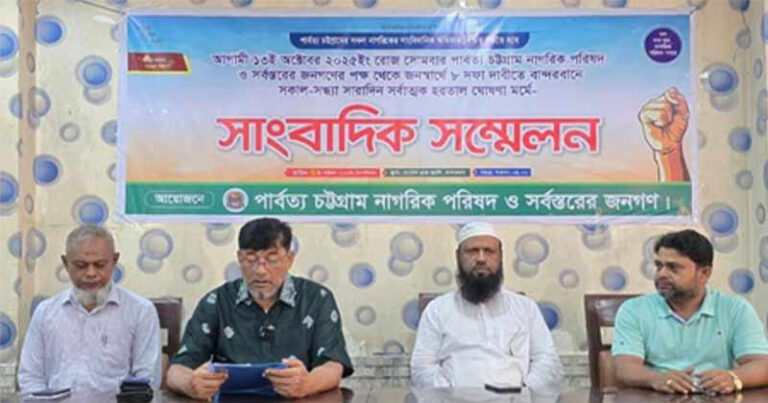 ৮ দফা দাবিতে বান্দরবানে আগামী ১৩ অক্টোবর সকাল-সন্ধ্যা হরতালের ডাক দিয়েছে পার্বত্য চট্টগ্রাম নাগরিক পরিষদ। বৃহস্পতিবার (৯ অক্টোবর) সকালে বান্দরবানের একটি হোটেলে আয়োজিত সংবাদ সম্মেলনে সংগঠনের কেন্দ্রীয় চেয়ারম্যান কাজী মো. মজিবুর রহমান এ ঘোষণা দেন।