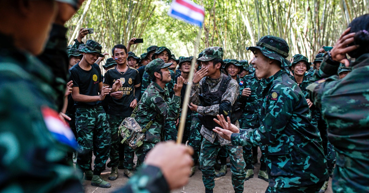 আনন্দমুখর সময়ে মিয়ানমারের কেএনডিএফ বাহিনীর একদল সেনা; Image source: Oliver Petrie/Hans Lucas